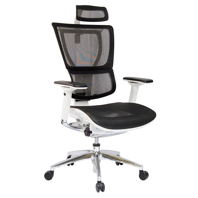 Sillón ejecutivo respaldo alto en malla con cabecera. Asiento deslizable Marco del asiento y respaldo en color blanco y cruceta de aluminio. Asiento color a elegir: Negro, Rojo