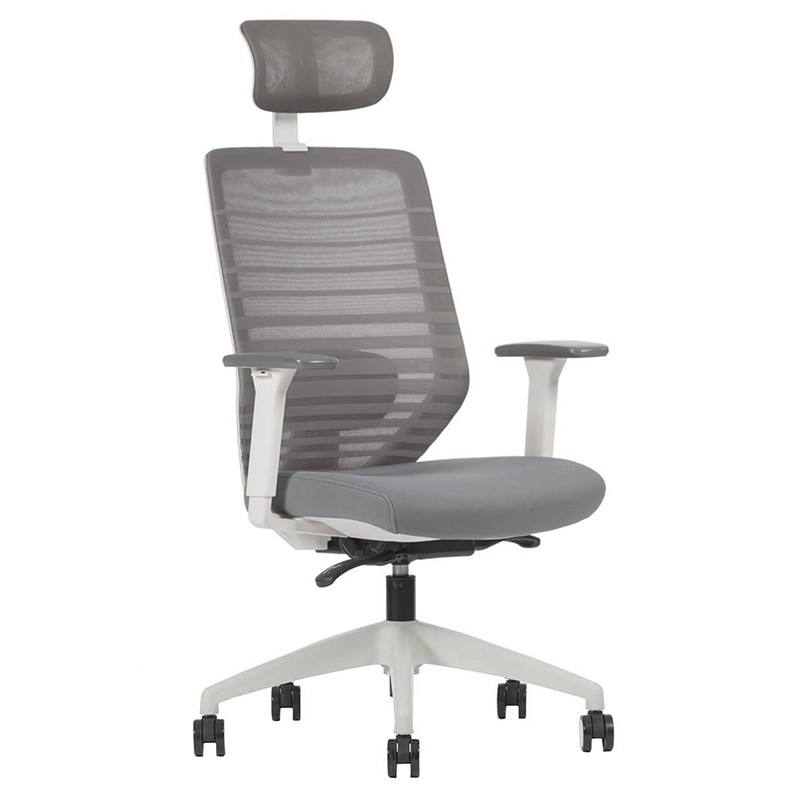 Mecanismo synchro multiposiciones. Descansabrazos con ajuste de altura. Respaldo ergonómico. Cabecera ajustable. Acojinamiento en asiento de poliuretano inyectado. Base de 5 puntas de nylon en color gris.