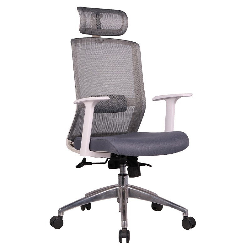 Brazos de polipropileno fijo color blanco. Respaldo con cabecera ajustable. Soporte Lumbar con ajuste de profundidad. Respaldo de malla de poliester. Base de Aluminio 27".