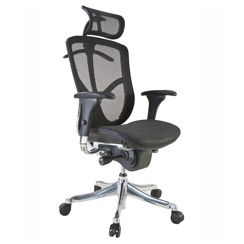 Sillón ejecutivo respaldo alto con cabecera. Asiento en malla en polímero termoplástico, con caída de cascada en la parte frontal y en la posterior con base perimetral de acojinamiento en poliuretano.