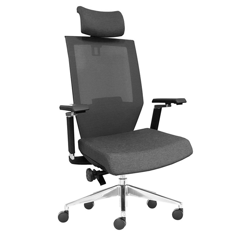 Los mejores precios y sillas de oficina mexico como la silla dinamarca con estructura color negro, cabecera ajustable 7 posiciones en altura y mecanismo rotable 360, respaldo alto tapizado en malla gris, inclinación de 8 grados mientras la posición está bloqueada t soporte lumbar ajustable,asiento deslizante en 4cm, tapizado en tela gris con espuma de poliuretano inyectado. Base de aluminio de 27". Mecanismo con perillas de auto-equilibrio y ajuste de tensión, palancas para ajuste de altura, ajuste de reclinamiento y slider. Brazos inteligentes 3D, con altura ajustable 6 posiciones y coderas de poliuretano suave, con ajuste de apertura.