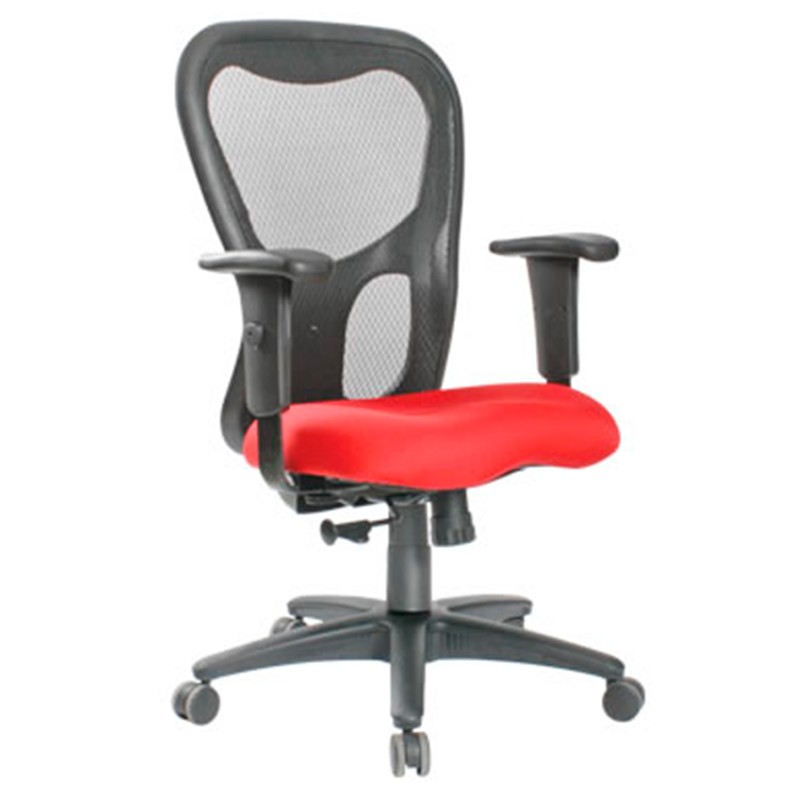 Respaldo en malla elástica, con soporte lumbar ergonómico integrado Mecanismo tipo sincronizado con regulador de tensión de la inclinación y bloqueo del mismo Descansabrazos solamente tienen ajuste de altura y profundidad