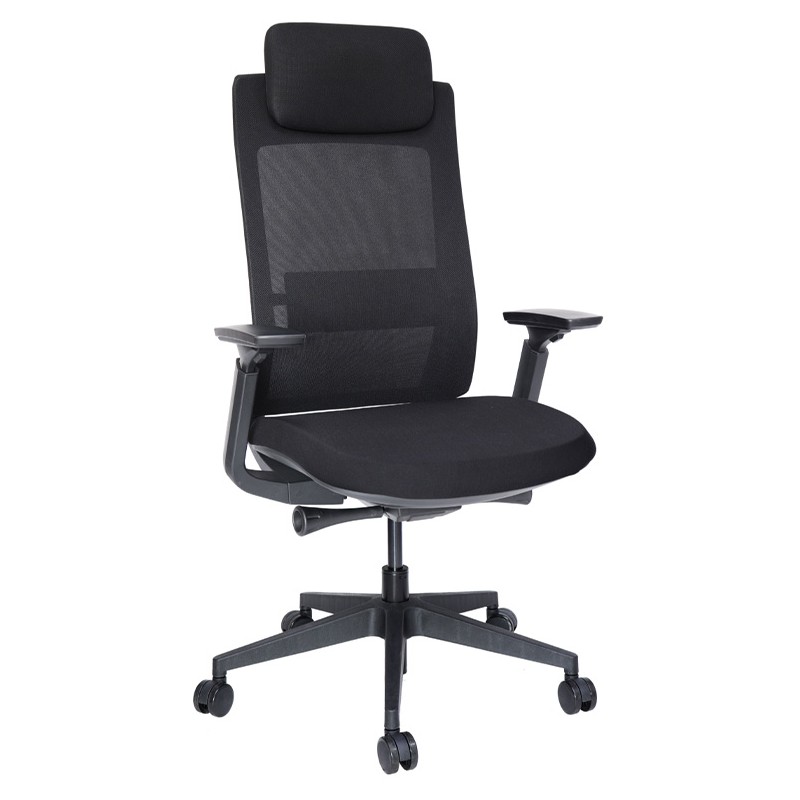 Base: estrella de 5 puntas en nylon reforzado, rodajas tipo dual y/o regatones. Elevación: por medio de pistón neumático que permite ajustar la altura del asiento. Mecanismo: de acero reforzado tipo articulado synchro con anti-shock y slider con palanca de bloqueo del pistón neumático, con palanca de bloqueo de el ángulo del respaldo y botón para el accionamiento del slider en sus diferentes posiciones. Brazos: tipo 3D giratorios y ajustables de altura en poliuretano semi-rígido y suave. Respaldo: en malla de diseño ergonómico con cabecera. Asiento: hule espuma de poliuretano inyectado flexible con densidad de 60 kgs/m³ con retardante a la flama y alta resilencia. Tapiz: respaldo de malla de color gris y asiento en tela o vinil al color de su elección de nuestro catálogo.