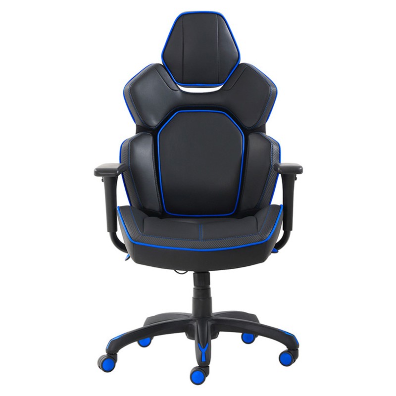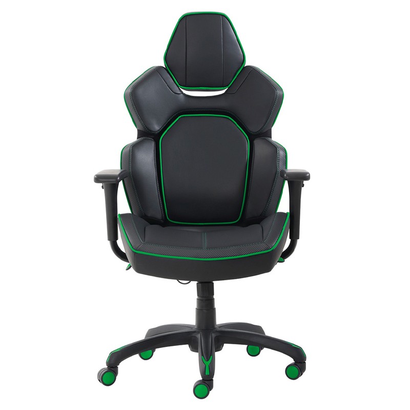 Silla con tapizado en vinil, color negro y vinilo de fibra, vista posterior en 3D que ofrece soporte lumbar continuo en cualquier ángulo.