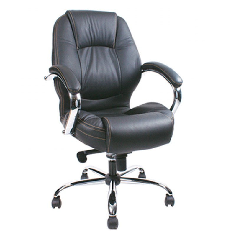•Tapizado en piel. •Mecanismo de rodilla. •Rodajas de nylon color negro. •Base cromada. •Sistema de elevación neumático terminado en cromo. •Mecanismo ejecutivo reclinable con bloqueo. •Asiento y respaldo concha de madera domada y contrachapeada de 16 mm. •Acojinamiento poliuretano flexible. •Brazos barra de acero con pad de poliuretano color negro. •Dimensiones: Alto: 125 cm. Fondo: 65 cm. Ancho: 64 cm.