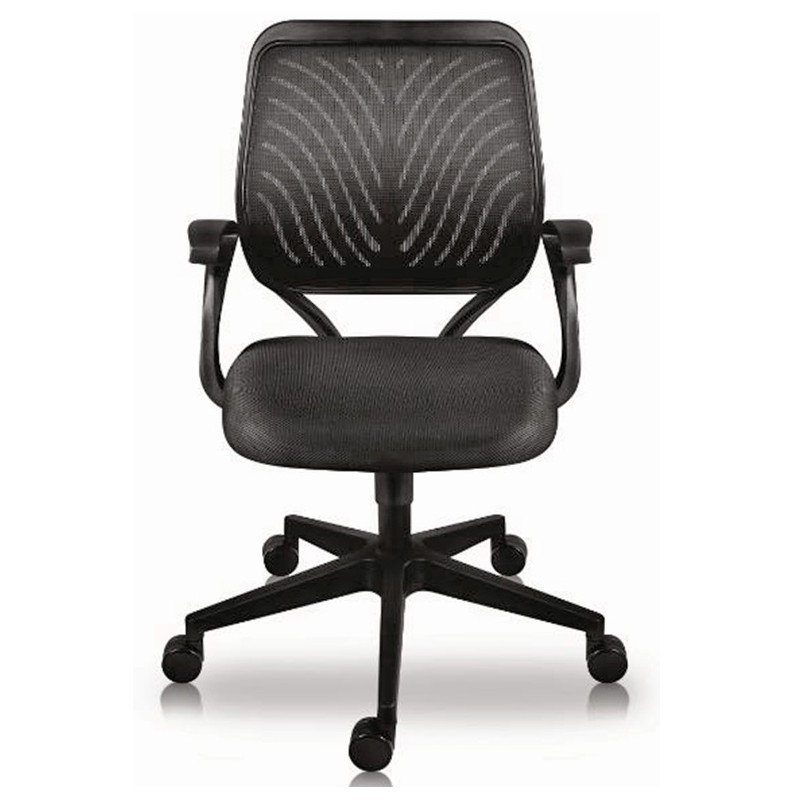 Respaldo tapizado con malla color negra. Brazos de polipropileno. Mecanismo ejecutivo con palanca para ajuste de altura, bloqueo del reclinamiento y perilla tensora. Pistón secretarial rebasador de base. Asiento tapizado en tela color negro conespuma de 6cms x 27Kgs/m3. Base pentágonal de nylon y rodajas desmopan.