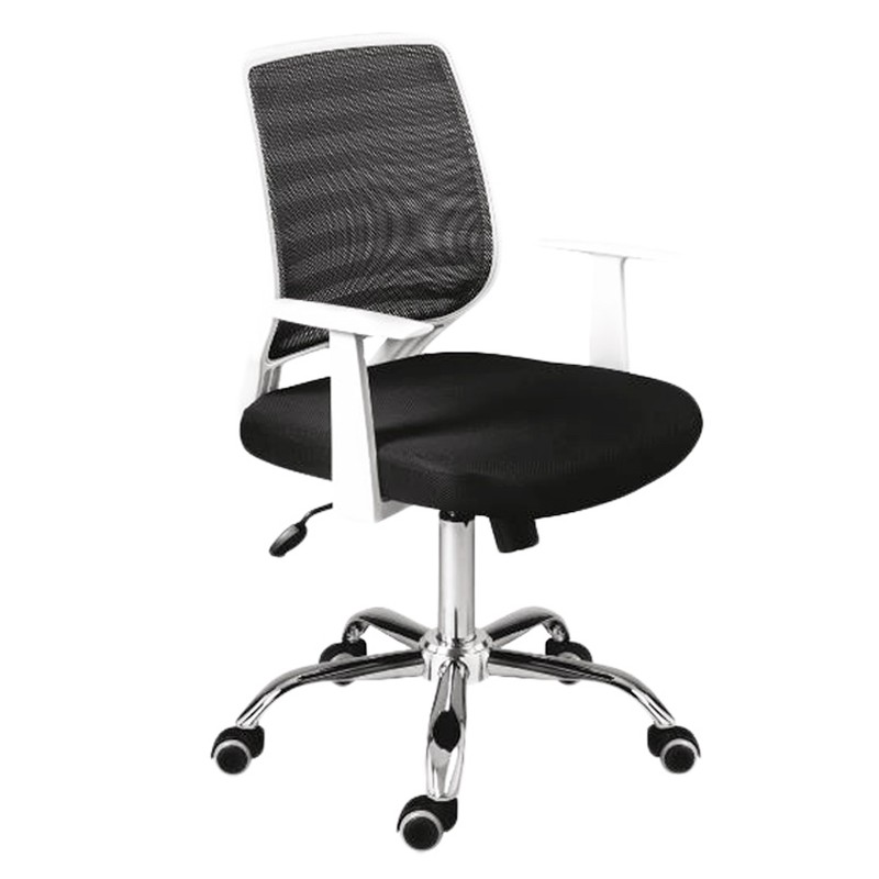 Sillas de Oficina ComodasRespaldo con marco y detalles traseros en polipropileno,tapizado con malla. Brazos blancos fijos de polipropileno en forma de T. Asiento tapizado en tela mesh con espuma