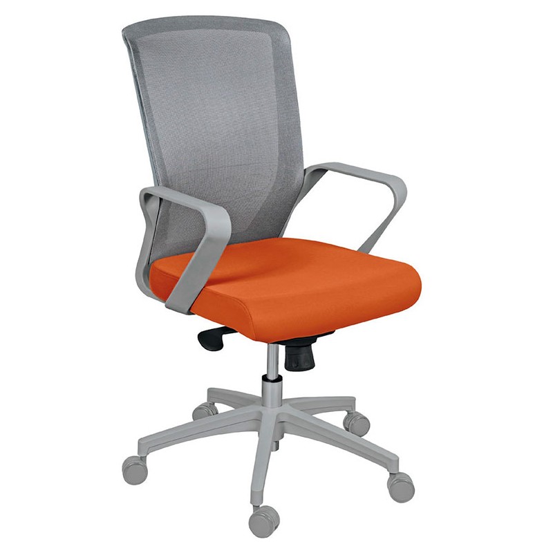 Asiento acojinado con espuma inyectada, tapizado en cualquiera de nuestros colores de línea, respaldo en malla gris, marco de la silla en color gris.