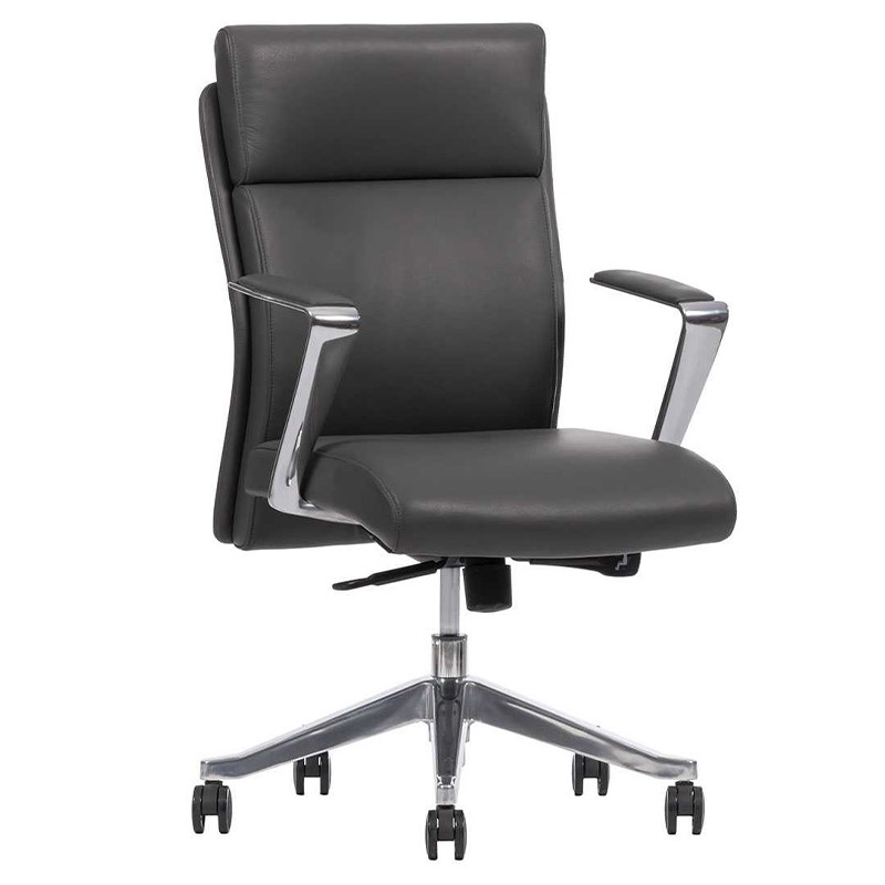 Mecanismo synchro multiposiciones. Descansabrazos de aluminio pulido con pad tapizado en genuine leather. Base de aluminio pulido. Asiento de polurietano inyectado.